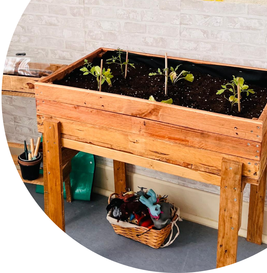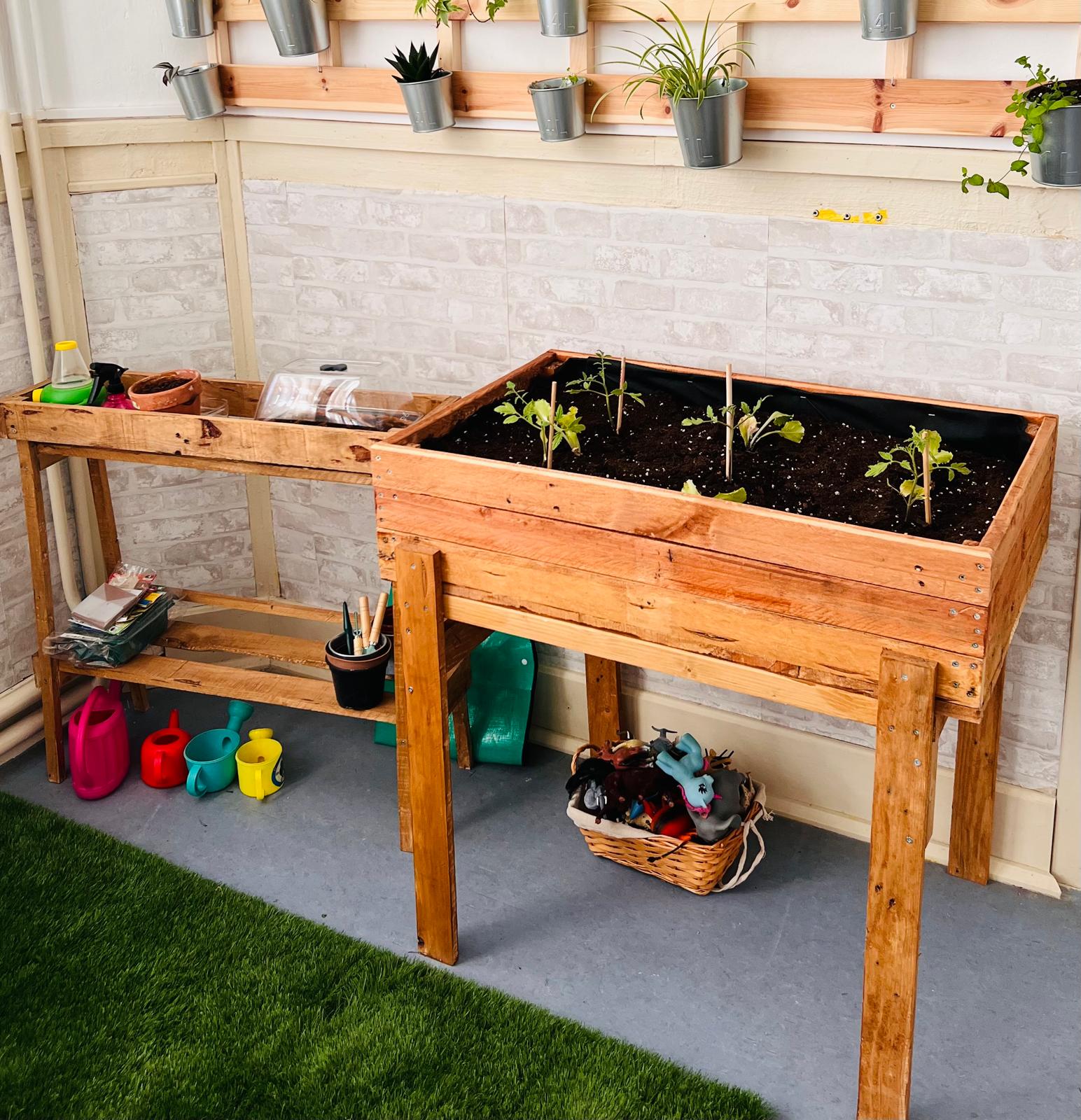 Estructuras hechas con madera reciclada y madera de pino. El huerto se realiza con altura personalizable. Cada pieza se realiza de forma artesanal. Mobiliario que dota tu aula de espacio donde trabajar habilidades jardineras y que fomenta su autonomía y responsabilidad.