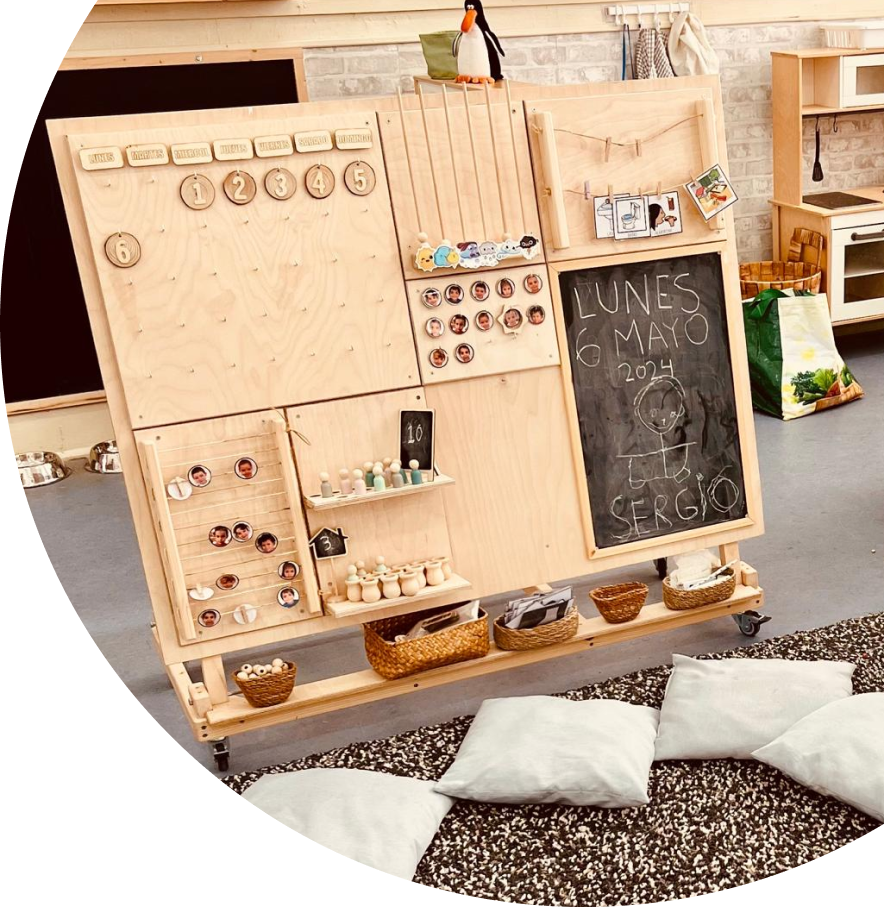 Asamblea de madera con módulos personalizables y con ruedas para una mejor disposición en el aula.
